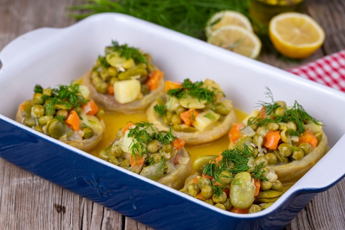 This is a traditional Mediterranean way of preparing vegetables. Here, artichoke hearts are slowly cooked in olive oil with carrots, peas, and dill. Serve this cold Mediterranean side dish, which is perfect for a healthy meal, and enjoy its delicious flavour.